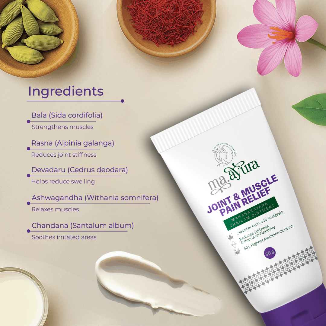 Experience fast, targeted relief for tired joints and stiff muscles with Ma.ayura Joint & Muscle Pain Relief Mahanarayana Thailam Ointment, a classical Ayurvedic formulation designed to soothe discomfort and restore mobility. Rooted in the ancient wisdom of Mahanarayana Thailam, this therapeutic ointment combines potent herbal extracts to reduce stiffness, relieve pain, and support recovery in joint and muscle conditions. With 30% of the highest medicine content, it penetrates deeply to calm inflammation, ease discomfort, and promote healing from within.