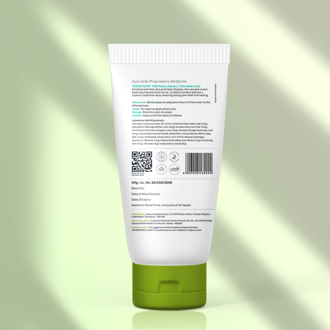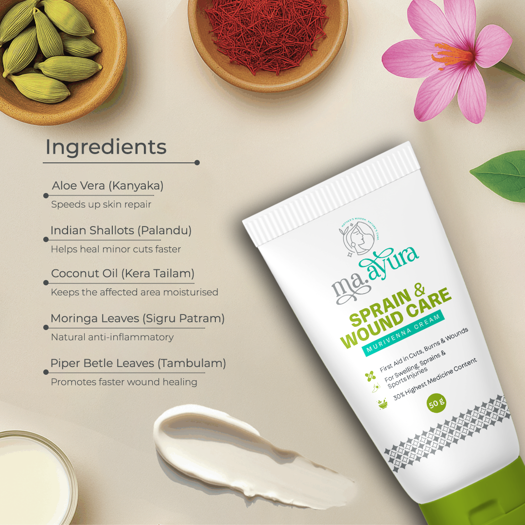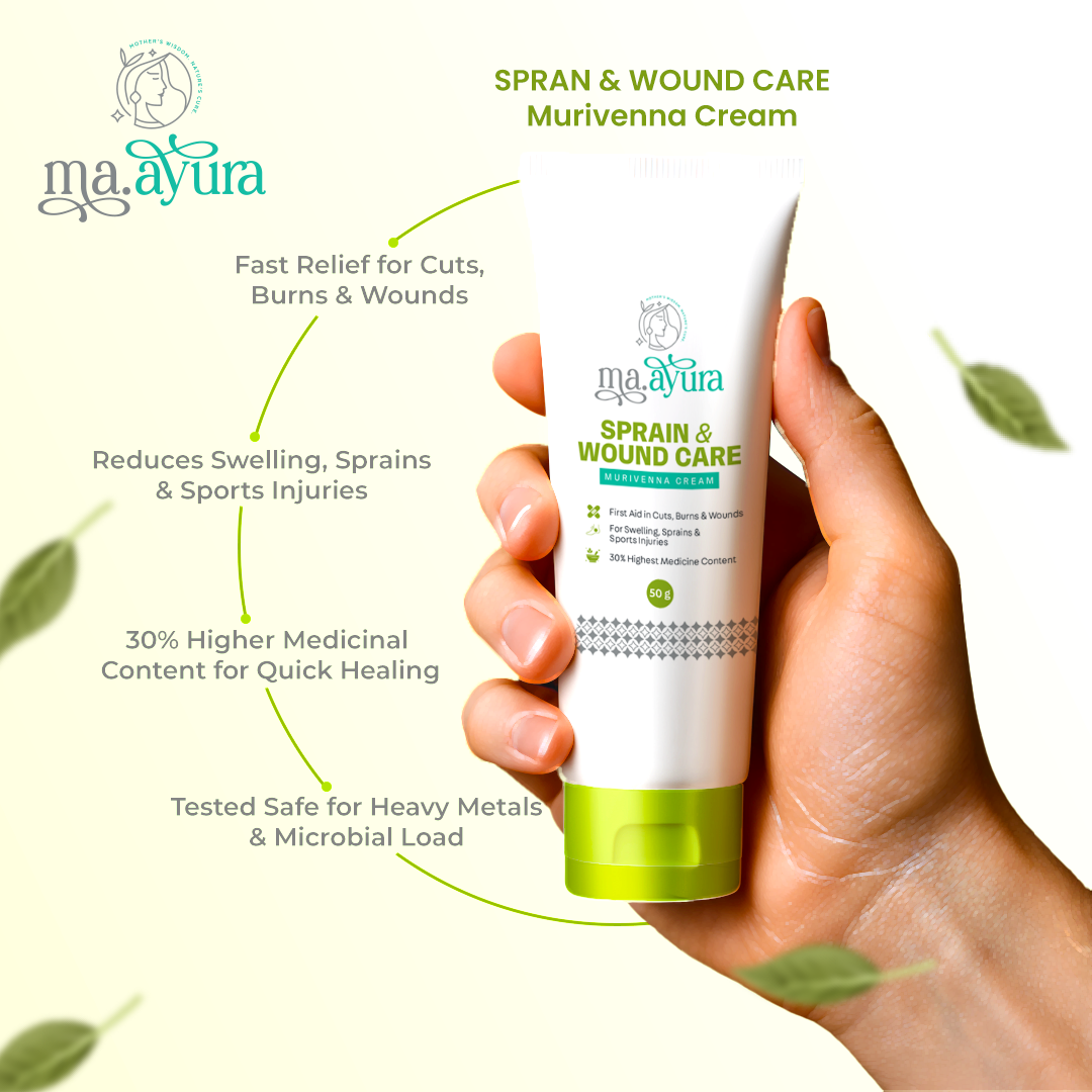 Get fast, effective relief for sprains, cuts, and wounds with Maayura Sprain & Wound Care Murivenna Cream, a traditional Ayurvedic formulation designed to accelerate healing and reduce discomfort. Rooted in the ancient wisdom of Murivenna, this therapeutic cream combines potent herbal extracts enriched with aloe vera and Indian shallots to soothe swelling, promote tissue repair, and provide superior medicinal value. With 30% of the highest medicine content, it penetrates deeply to calm inflammation, ease pain, and support faster recovery from sports injuries, minor burns, and everyday wounds.